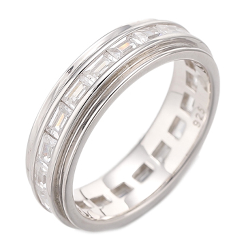 3.93Кольцо «Вечность» с радужным кубическим цирконом в огранке «багет» из родированного серебра
